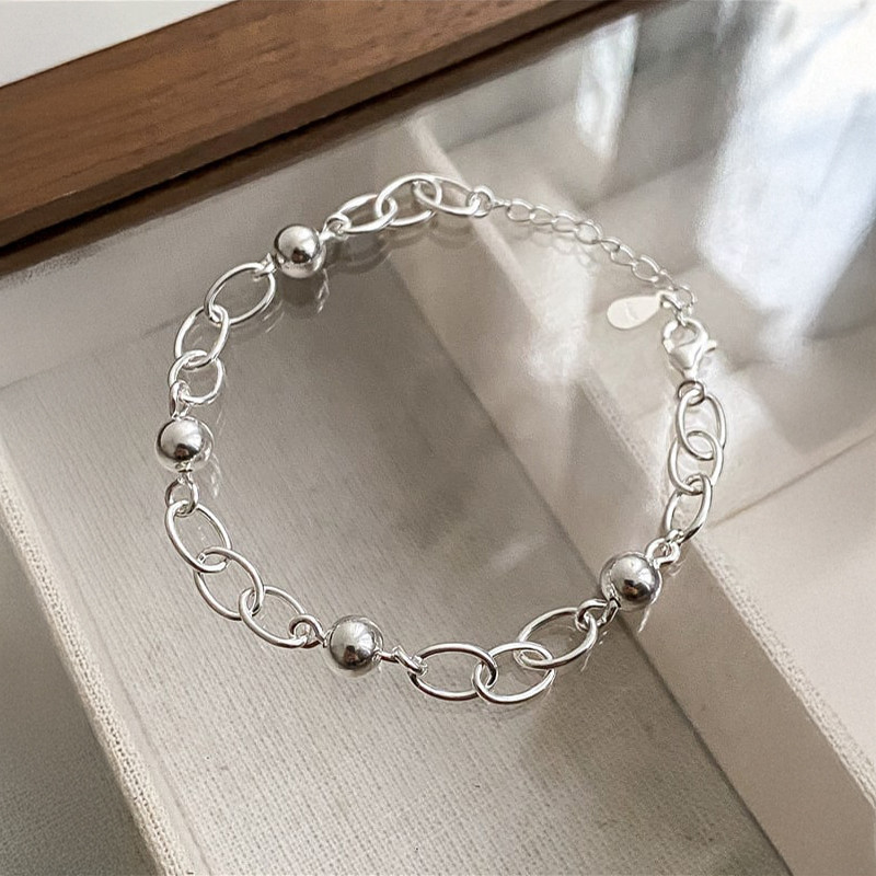 Модерна сребърна гривна, комбинираща по три елипсовидни елемента с малко топче тип мънисто, създавайки красив кръговрат. Моделът се наложи като един от най-предпочитаните в света на сребърната бижутерия и бързо стана любим на дамите със своя универсалност. Към гривната има и удължител, който позволява лесно поставяне, сваляне и регулиране на дължината.