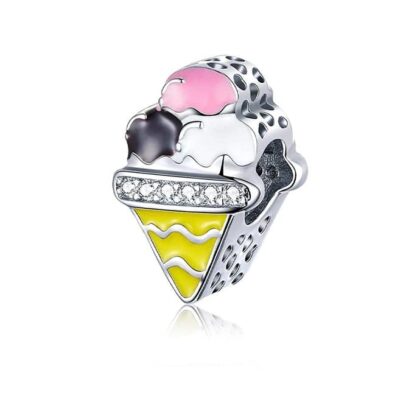 Модерно сребърно бижу във формата на сладолед. Фунийката на любимото ледено изкушение е от жълт емайл и малки блестящо бели циркониеви камъни. По страните ѝ са оформени сърца. Към талисмана има и три сладоледени топки от черен, розов и бял емайл. Също като десерта, от който е вдъхновено, бижуто носи наслада и напомня целогодишно за свежите летни истории. Идеално попълнение е към сребърна гривна или колие за визията през топлия сезон. Перфектен подарък е и за дете.