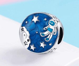 Лесно е да полетиш към звездите с правилното бижу. Талисманът от сребро 925 е в кръгла форма, изобразявайки върху син емайл полет на космонавт в безкрая на пространството. По страните на бижуто са обозначени многобройни звезди, които засилват усещането за свобода. Сребърното украшение стои еднакво добре поставено на гривна или верижка. Подходящо е за подарък за всеки повод.