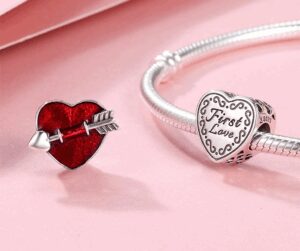 Любовта винаги оставя следи в сърцето, особено като се случи за първи път. Този специален момент заслужава отбелязване чрез талисман с форма на сърце, инкрустиран от едната си страна с червен цирконий и пробит със сребърна стрела. От другата има надпис First Love, обграден с многобройни знаци на безкрайността. По страните на талисмана пък са изобразени и няколко сърчица. Отличен подарък за Свети Валентин, за годишнина или просто в чест на любовта.