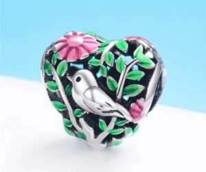 По пътя за Рая ни отвежда красивият сребърен талисман във форма на сърце. В него са разположени зелени клонки и розови цветчета от емайл, а точно по средата е нежна песнопойна птичка, изработена от сребро. Поставен около врата̀ или ръката, той веднага привлича вниманието и създава райско усещане. Талисманът може да се превърне в чудесен подарък за жена за всеки повод.