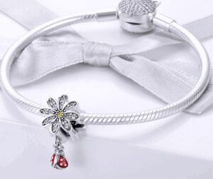 Красотата на природата е събрана в това нежно талисманче от сребро 925, което подхожда на бижу около врата̀ или китката. Сребърното цвете е покрито с бели цирконий, които са различни по големина по всяко листче, а по средата пък изпъква жълт камък. Нежно към него е прикрепена висулка от калинка с червен емайл и с няколко блестящи цирконий. Подарява се с пожелание за много късмет и красота в дните за специален повод.