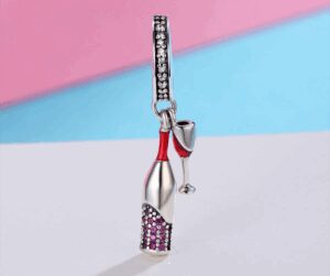 За любителите на виното е създаден този елегантен талисман от сребро. Той изобразява бутилка вино с бели и розови цирконий около нея и чаша, която има червен емайл. Двата елемента са прикрепени към висулката чрез сребърна халка, която е инкрустирана с блестящи и различни по големина цирконий. Това е точният подарък за Нова година, за осми март, за рожден ден, персонален подарък за винолюбители.