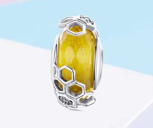 Жълтият стъклен камък с брокат е като мед върху бижу. Около него чрез сребърни елементи и бели цирконий са изобразени и клетките на пчелната пита. В средата на талисмана има процеп, който позволява въртенето му на 360 градуса, за да се разкрие напълно неговата красота. Това позволява да бъде окачен около врата̀ или на сребърна гривна около китката. Нежен подарък за жена.
