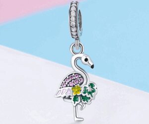 Екзотиката на тропика може да се пренесе върху гривна или верижка с този талисман от сребро. Той е във формата на фламинго, като от едната страна е инкрустиран с розови цирконий и емайл по тялото на животното, а растенията около него са в два нюанса на зелен емайл. Халката, към която е прикрепена висулката, е също сребърна и е обсипана с бели камъчета. Невероятен летен подарък и аксесоар.