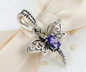 Талисманът е сребърен, с печат 925. Крилете на водното конче са изцяло от благородния метал, като останалата част от него е покрита с цирконий в лилаво, розово и жълто. Животното е символ на мъдростта и трансформацията и затова е идеален подарък за абитуриент, рожденик или за юбилей. Изящната му визия позволява да бъде комбинирано на синджир или на гривна.