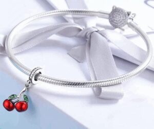Елегантно сребърно бижу с форма на две черешки. Състои се от блестяща основа с циркониеви камъни, към която са прикрепени плодовете с червено покритие. За по-голяма детайлност листенцата на черешките са декорирани със зелени цирконий. Сребърната висулка е символ на лятото, свежестта и природата. Може да се носи на гривна или синджир, за да придаде уникалност на визията и да подчертае индивидуалния стил. Красив подарък за жена, за рожден ден или друг личен повод.
