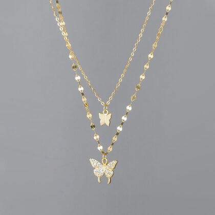 Атрактивно и модерно колие от сребро 925, с което винаги ще си под светлината на прожекторите. Отличава се със своята изработка от две различни по вид и дължина плетки, захванати с удобна закопчалка и удължител. На всяка плетка има сребърна пеперуда, като едната е по-голяма и покрита с изящни бели камъни. Освен символ на свободата, две пеперуди заедно се приемат и като израз на вечна любов и семейно щастие. Налично е в бяло сребро и с позлата.