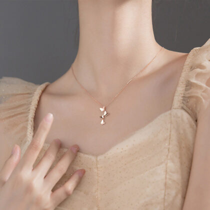 Волни и красиви четири пеперуди са акцентът във финото сребърно колие. Когато светлината попада върху тях под различен ъгъл се наблюдават интересни отблясъци. Колието разполага с удължител, който позволява регулиране на дължината според личните предпочитания. Предлага се в два цвята – бяло и с розова позлата – за да пасне на всеки вкус и да се адаптира към всяка визия.