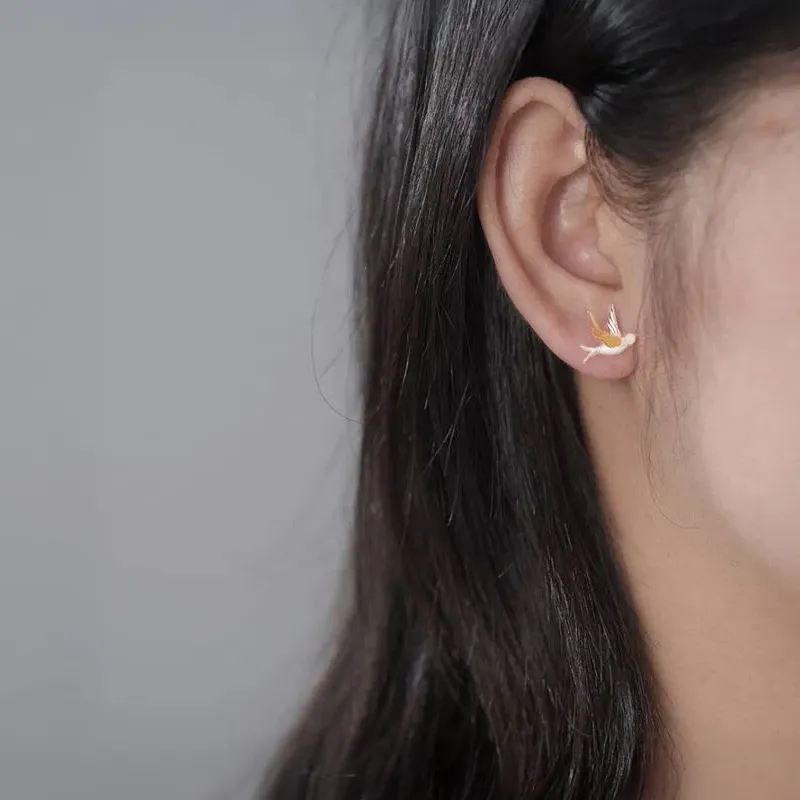 Полети с вятъра към необятните простори и с помощта на сребърни обеци във вид на птици. Те са покрити с перлен блясък, а едното им крило е в жълт нюанс, което позволява комбинирането с различни по вид бижута. Обеците се поставят на ухото с винт и носят усещане за волност и свобода.