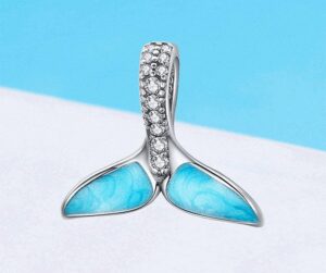 Талисманът за гривна и синджир е направен от сребро, бели цирконий и син емайл. Той е във форма на опашка на риба, тъй като тя символизира плодородието и женското начало. Със силата на водата, рибата изпълнява желания и затова се смята за вълшебна. Вложена като елемент в това бижу, е чудесен начин да се отправи пожелание за късмет и да се подари с много любов като персонален подарък за жени зодия Риби за рожден или имен ден.