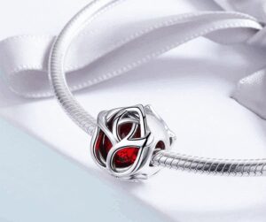 Понякога цветята казват повече, отколкото думите. Такава е и идеята на този красив сребърен талисман под формата на роза, нежно приютила в сърцевината си голям камък цирконий в червен цвят. Цветето е символ на любовта във всичките ѝ измерения. Затова и бижуто носи послание за романтика, обич и е предназначено за онази специална жена, на която да кажеш Обичам те. Подари за 8-и март, за Деня на влюбените, за личен празник или без повод – за да зарадваш някого.