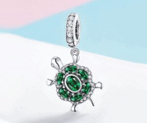 Зеленият цвят се свързва с обновлението, изобилието и оптимизма, а костенурката – с мъдростта. Обединени заедно в сребърен талисман за гривна или колие, те са чудесен подарък за годишнина, юбилей, рожден ден или просто без повод, но с пожелание за успех и късмет. Бижуто е инкрустирано с бели цирконий по основната халка, както и по тялото на костенурката. Корубата на животното е обсипана от многобройни зелени камъни, които са поставени между различни сребърни орнаменти.