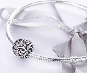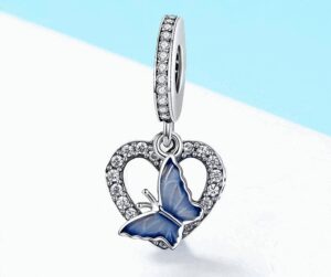 Подарък за рожден ден, за осми март, Свети Валентин, годишнина – за всичко хубаво, е този талисман, изработен от сребро 925. На основата му, която пасва на синджир или гривна, са инкрустирани бели цирконий. От нея се спускат две висулки. Едната е сребърно сърце, което е обсипано с камъчета и допълнено от нежни гравирани сребърни елементи, а другата е пеперуда, оцветена в син емайл. Талисманът е символ на красотата на любовта.