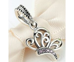 Фино бижу от сребро. Изобразява нежна пеперуда с красиво изработени криле и тяло, покрито с малки камъни цирконий в лилавата гама. Крилатото създание символизира красотата на природата, извисяването и новото начало. Чудесен подарък за жена, за рожден ден, за започване на ново начинание или смяна на дома.