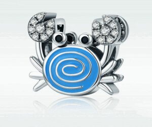 Интересно лятно бижу, изработено от сребро във формата на малко раче. Щипките му са украсени с изящни циркониеви камъни, а тялото му е допълнено от син емайл. Морският представител се свързва със силната интуиция и напомня, че независимо от посоката на движение, път винаги има. Талисманът е подходящ за носене на гривна или синджир. Чудесен морски подарък и идеален елемент към лятната визия. Подходящ и за представителките на зодия Рак.