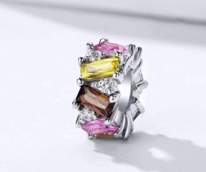 Сребърен талисман в асиметрична форма. С атрактивен външен вид, с разноцветни камъни. Цялостната визия на бижуто носи дъх на свежест, романтизъм и закачливост. Подходящо е за летните дни или специални поводи. Носи се на верижка или на сребърна гривна.