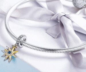 Изискано сребърно бижу, атрактивно оформено като слънчеви лъчи, приютили полумесец и обсипани с блестящи бели камъни цирконий. Към тях има добавена и красива звезда с позлатен кант и голям син циркониев камък. Освен, че е представена изключително красиво, тази небесна среща напомня, че няма невъзможни неща. Талисманът се съчетава с гривна или колие. Подходящ подарък за приятели, за близки, които рядко се виждат или просто като ключов акцент към индивидуалния стил.