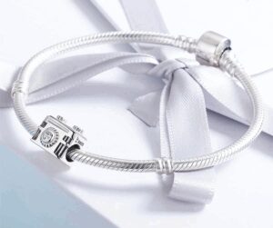 Талисман от сребро 925, изработен под формата на фотоапарат и декориран със сребърни елементи. Мястото на обектива е инкрустирано с красив камък от бял цирконий. Подходящ за носене на гривна и/или на колие. Бижуто е подходящо за всички, които обичат да запечатват красивите моменти на снимка. Подари за повод или просто, за да зарадваш любим човек.