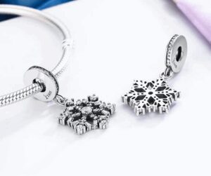 Изящество и красота излъчва този сребърен талисман с бели циркониеви камъни. Към него има голям висящ елемент под формата на снежинка, също инкрустиран с различни по размер и вид камъни цирконий. Бижуто носи кристална чистота и е подходящ подарък през най-вълшебното време от годината – Коледа или Нова Година.
