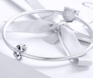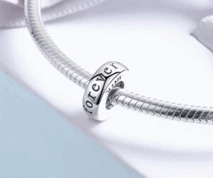 Нежен стопер от сребро за гривна и за колие. Бижуто е с овална форма, върху която е изобразен надпис love forever. Може да се носи самостоятелно, а благодарение на силиконовия си уплътнител предотвратява изхлузване на останалите талисмани. Чудесен персонален подарък за всякакъв повод.