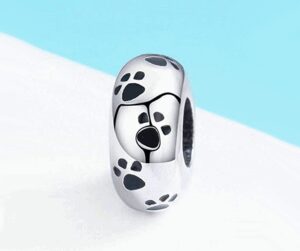 Прецизно изработен стопер от сребро. Красивото бижу е със силиконов уплътнител, който позволява свободно движение по гривната или синджира. Също може да бъде позициониран на едно място и да не позволява изплъзване на други талисмани. Изобразените лапички по стопера го правят подходящ подарък за всички, чиито четириноги приятели са оставили следа в сърцето.