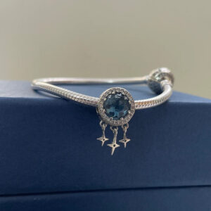Красив сребърен талисман в кръгла форма. Състои се от голям син камък цирконий и малки прозрачни камъчета около него. Към талисмана има и три висящи елемента под формата на падащи звезди, в центъра на които са инкрустирани бели цирконий. Бижуто стои еднакво добре и на гривна, и на колие.