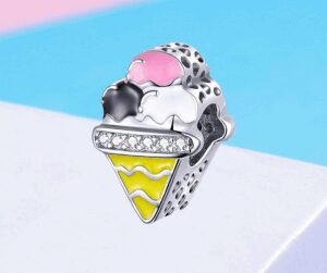 Модерно сребърно бижу във формата на сладолед. Фунийката на любимото ледено изкушение е от жълт емайл и малки блестящо бели циркониеви камъни. По страните ѝ са оформени сърца. Към талисмана има и три сладоледени топки от черен, розов и бял емайл. Също като десерта, от който е вдъхновено, бижуто носи наслада и напомня целогодишно за свежите летни истории. Идеално попълнение е към сребърна гривна или колие за визията през топлия сезон. Перфектен подарък е и за дете.
