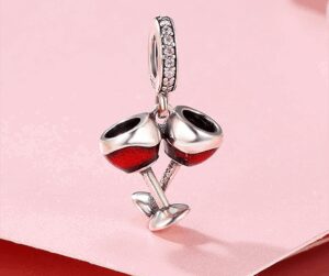 Любовта е вино и виното е любов, а тях и всичко хубаво в живота се празнува с „наздраве“. Талисманът е изработен от сребро 925, като халката-основа е обсипана с бели цирконий. От нея се спускат две преплетени сребърни чаши, които са пълни с червено вино, изобразено от червен емайл. Изкусително красиви, поставени на всякакъв вид бижу, стоят невероятно. Подходящи за подарък за Свети Валентин, за любителите на виното или носени просто за разкош.
