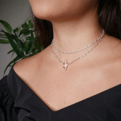 Съчетавайки елегантност и модерна естетика, колието излъчва изтънченост и авангардност. Подходящо както за ежедневна употреба, така и за специални поводи. Веригата е лека, подчертаваща всяко облекло с финес и блясък.