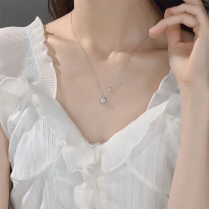 Изящно колие от сребро проба 925 с два сияещи елемента — звезда и слънце, инкрустирани с цирконий. Символ на вътрешна светлина и хармония, този аксесоар добавя елегантност и мистика към всеки стил. Перфектен избор за жената, която носи своята вселена със себе си.