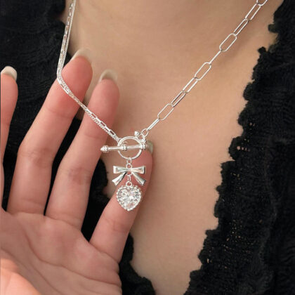 Главният акцент на колието е изящен висулка във формата на сърце, обсипана с блестящи циркониеви камъчета, която нежно се спуска под елегантна панделка. Верижката е с уникален дизайн. Закопчаването на колието също впечатлява със своя стил и функционалност, което придава завършеност на този луксозен аксесоар. Идеалният избор за специални поводи или като израз на вашата любов и привързаност към някого. Това колие е не просто бижу, а символ на елегантност и романтика, който ще добави неповторим блясък към всяка визия.