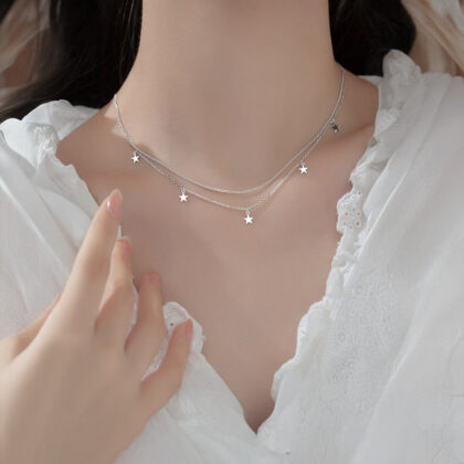 Това изящно многослойно колие със звездички е идеалното допълнение към всяка визия. Изработено от сребро 925, нежният дизайн съчетава минималистичен стил и елегантен блясък, придавайки нотка на магия на всеки тоалет. Подходящо за ежедневно носене или специални поводи, то ще ви напомня да достигате нови върхове с всяка стъпка и да сбъднете мечтите си.