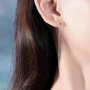 Сребърни обеци с дизайн на фини кръгове, украсени с кубични цирконий. Дългите, тънки верижки придават на обеците лекота и ефирност, като същевременно създават впечатление за деликатен и модерен аксесоар. Предлагат се в класическо сребро и розово злато, което ги прави идеални за всеки повод и стил.