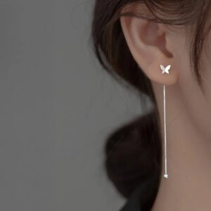 Нежност, обаяние и красота са съчетани във висящите сребърни обеци, налични в бял и в жълт цвят. Те се поставят лесно на ухото чрез промушване, което позволява регулиране на дължината. Акцентът им е във фината сребърна пеперуда, която застава на меката част на ухото и носи усещане за пърхаща волност. Обеците завършват със сребърно топче, което придава деликатен баланс на визията им. Подари на жена или момиче, или придай волна красота на собствения си стил.