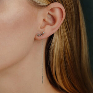 Сребърни обеци, тип полухалки, които се поставят чрез винт. Дизайнът им от два дъговидни и свързани елемента създава илюзия за две бижута. За допълнителна нежност и елегантност, моделът е декориран с малък бял цирконий. Обеците могат да се адаптират и с други по вид бижута, но се отличават и носени самостоятелно. Те са подходящи както за офиса, така и за парти излъчване.