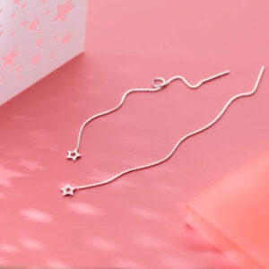 Висящи сребърни обеци, съставени от класически синджир, който застава зад ухото, а отпред сияе малка сребърна звезда. Избери между модел от сребро в бял или жълт цвят и придай на визията си звездно очарование.