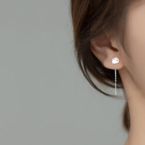 Фини сребърни обеци, които се промушват. Съставени са от дребен синджир, които свободно пада зад ухото, а на меката част остава формата на сребърно зайче, детайлно украсено с розов и черен емайл. Пухкавото животинче е символ на късмет и това е посланието и на обеците. Подходящи са за носене и от най-малките дами.