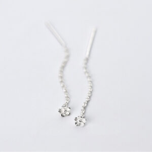 Един от най-женствените модели сребърни обеци. Представляват нежна класическа плетка, а за повече детайлност са допълнени с малки цветчета, изглеждащи много реалистично. Промушват през ухото и висят свободно, а дължината може да се регулира според предпочитанията. Класическият сребърен цвят ги прави универсални и лесни за съчетаване с всякакво облекло. Подари за Цветница, Деня на жената или друг личен повод.