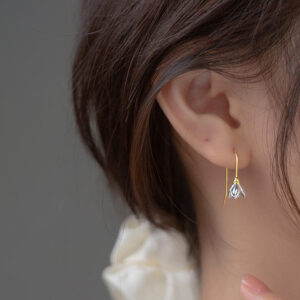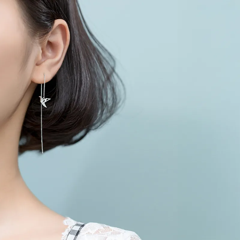 Блясък и изящество намират израз във висящи сребърни обици. Следват актуалната тенденция за промушване през ухото и регулиране на дължината. Красотата им се дължи на нежна плетка, съчетана с фигура тип оригами, инкрустирана с цирконий. Съчетай ги с нашето сребърно колие и ще получиш завършена визия, наподобяваща произведение на изкуството. Подходящ подарък за дами с арт интереси или запленени от японските традиции.