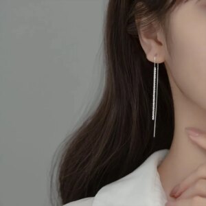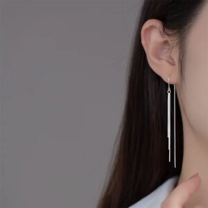Нежни и много красиви обеци от сребро 925. Състоят се от висяща вълнообразна част, която се промушва през ухото и застава отзад. На предната част на ухото остава видимо малко сребърно топче. Обеците са много фини и внасят деликатна красота към празнична или ежедневна визия. Подходящи са за подарък за рожден ден, за имен ден, за 8 март, за Коледа или Нова година.