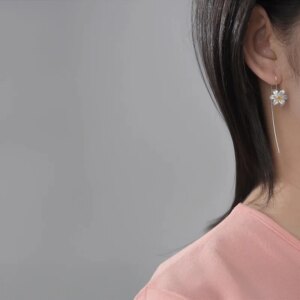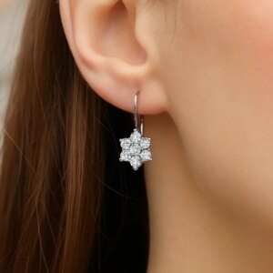 Нежни висящи обеци от сребро във формата на цвете, инкрустирани с блестящи циркониеви камъни. Елегантни и леки, те са изключително удобни за носене, с хипоалергенна изработка, безопасна за чуствителна кожа. Идеални за специални поводи или ежедневна нежна визия, тези обеци са прекрасен подарък, който ще зарадва всяка дама с фин и изискан стил.