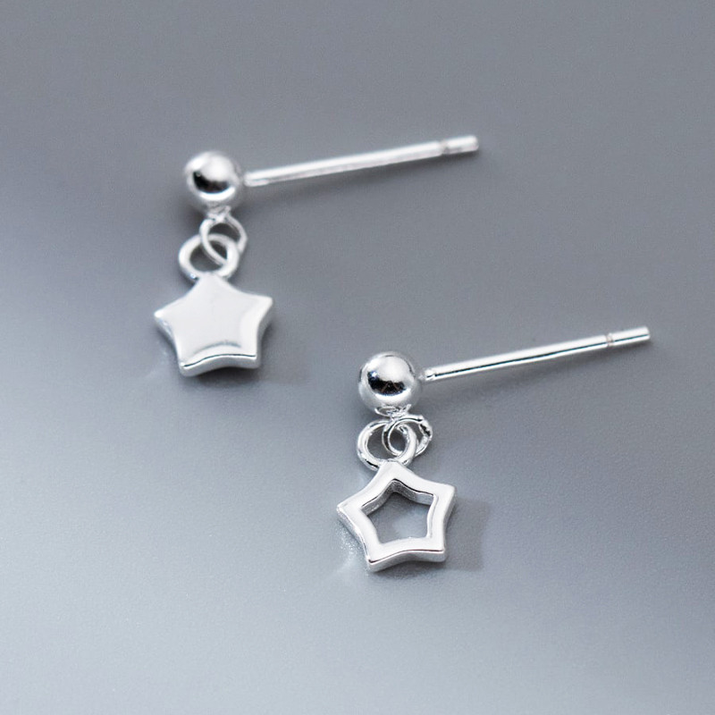 Обици с модерен и минималистичен дизайн. Всяка обица се състои от малка твърда част, която се промушва през ухото, а в меката част стои свободно малка сребърна звезда. Бижутата са изработени от висококачествено сребро 925 и излъчват елегантност и шик. Подходящи са за всекидневно носене, както и за вечерни събития.
