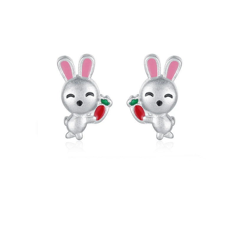 Покани веселото настроение с очарователни сребърни обеци зайчета. За повече детайлност са допълнени с цветен емайл и се закопчават с винт, което ги прави удобни и сигурни за носене дори и от деца.