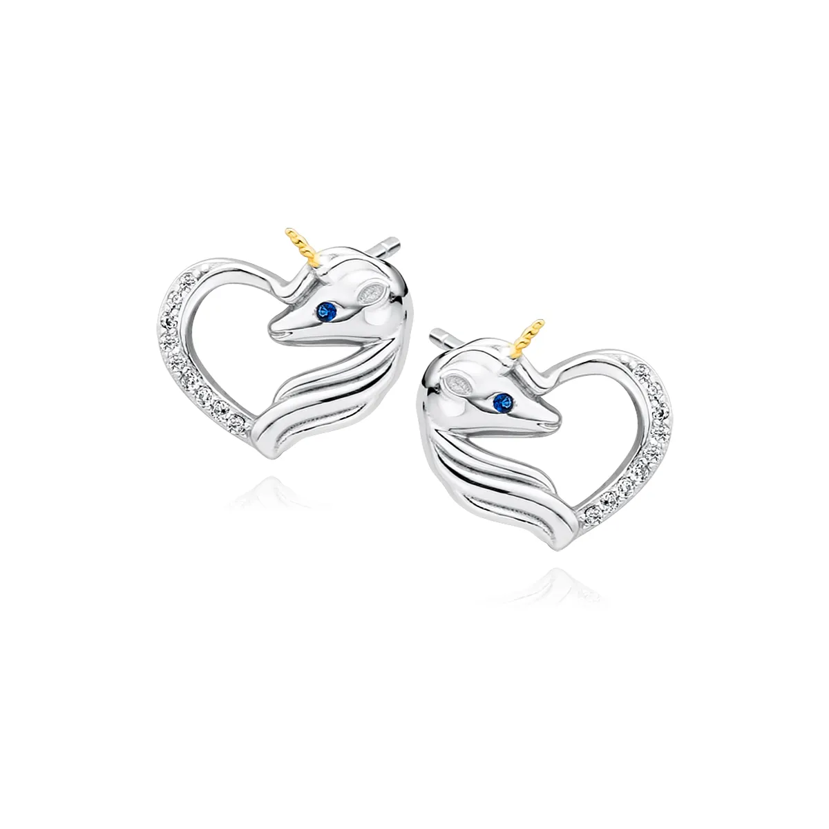 Очарователни сребърни обеци с форма на еднорог, завършени с елегантен златен рог – перфектният аксесоар за деца или млади дами. Изработени от хипоалергенно сребро, те са символ на магия и въображение. Обеците са с разлизен цвят инкрустирани цирконии в рамката на сърцето – бял, розов и лилав