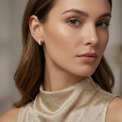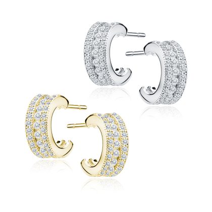 Изразителен дизайн, създаден да впечатлява. Тези обеци-халки са украсени с няколко реда фино шлифовани цирконий, които създават богат, дълбок блясък и усещане за лукс. Комбинацията от обемна форма и прецизна подредба на камъните придава изтънчена елегантност, без да губи модерния си характер. Предлагат се в сребрист и златист вариант, което ги прави идеален акцент както за официална визия, така и за стилен завършек на вечерен тоалет. Повърхността на бижутата е внимателно проектирана, така че да се разположат възможно най-много малки камъни близо един до друг, придавайки невероятен външен вид и блясък.