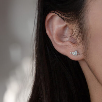 Минималистични сребърни обеци, които нежно проблясва с деликатност и очарование. Изработени са под формата на сърце, обсипано с блестящи камъни и елемент стрела, която минава през него. Моделът обгръща с обич, създава емоции и може да бъде красив подарък, изпълнен с чувства. Поднеси за рожден ден, имен ден, годишнина, Свети Валентин или просто озари деня си.