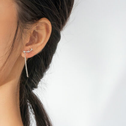 Привлечи вниманието с интересни сребърни обеци. Разчупеният им дизайн се състои от три звездни форми, свързани с дъга, които стоят по ухото и се закрепят с винтче. От бижутата се спуска и нежна класическа плетка, която се движи свободно. Обеците са достатъчно атрактивни, за да бъдат носени като акцент, но позволяват и съчетанието с други сребърни бижута на звездна тематика.