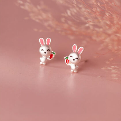 Покани веселото настроение с очарователни сребърни обеци зайчета. За повече детайлност са допълнени с цветен емайл и се закопчават с винт, което ги прави удобни и сигурни за носене дори и от деца.