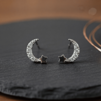 Блясъкът на нощното небе се пренася върху сребърната основа на минималистичните обеци, които изобразяват полумесец и звезда. Формата на Луната е обсипана с различни по големина циркониеви камъни, чиито отблясъци създават усещането за силно сияние. То се допълва и от малката сребърна звезда, прикрепена в горната част на обицата. Подобно стилно бижу може да се превърне в мил жест на изненада към любимата жена, момиче или дете.